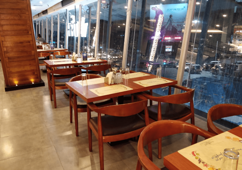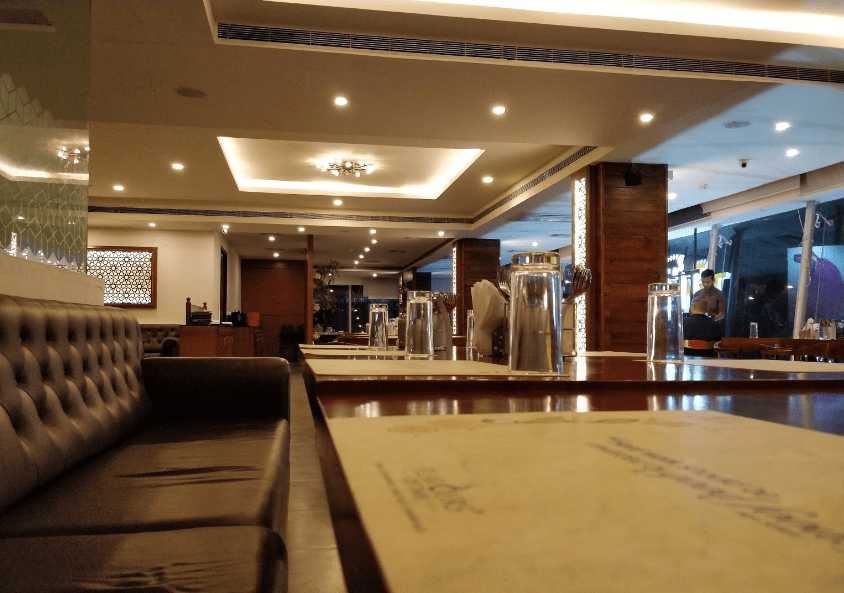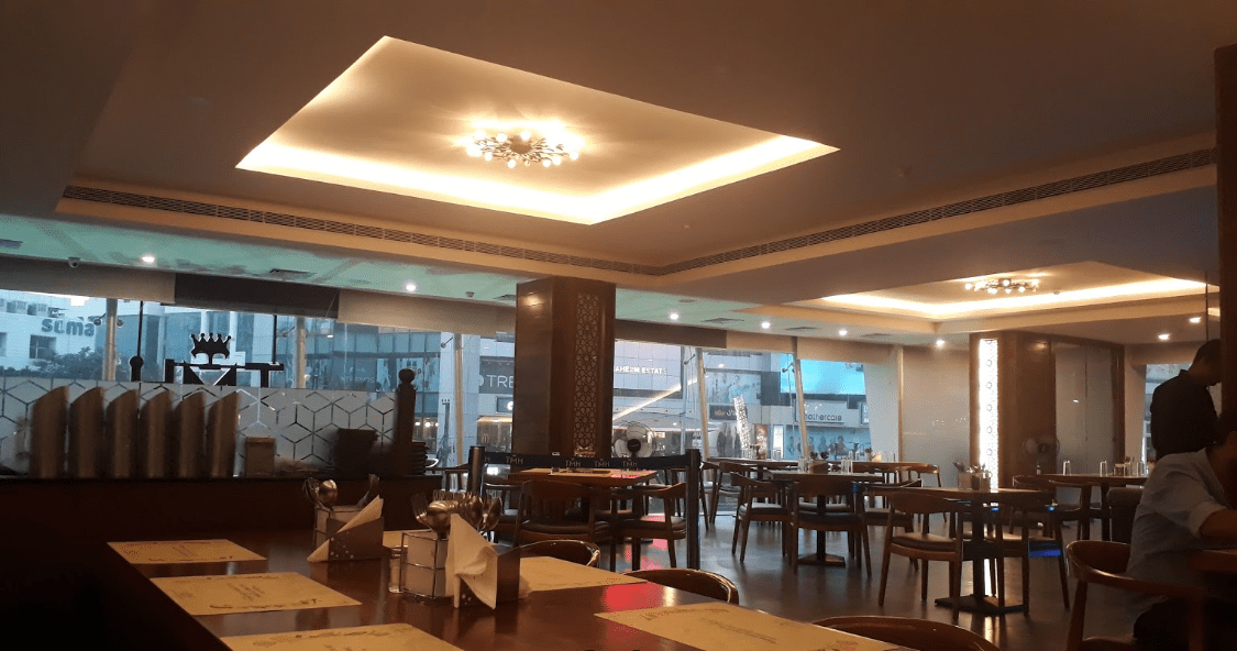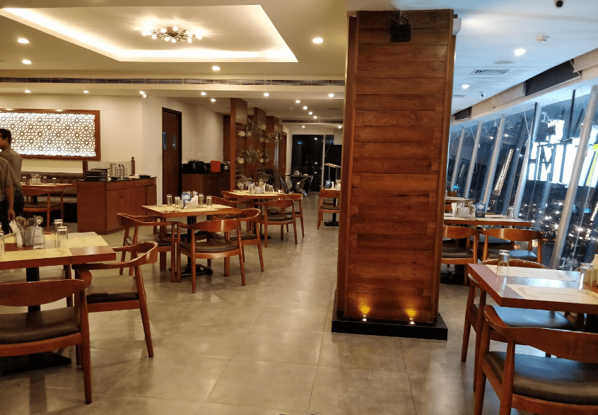 The interior is state-of-the-art, reflected through the art pieces and the different patterns gracing the lavish space, in varied accents of walnut and beige on a muted background. Regal-style tables flanked by exceptionally comfortable chairs ensure an exquisite dining experience.