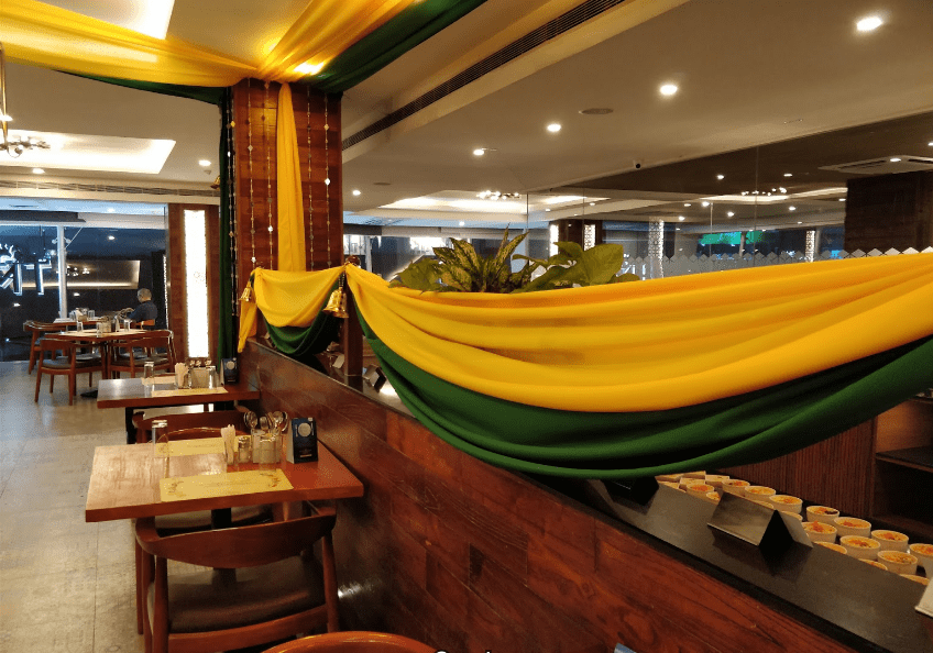 The design brief was to ensure a memorable, comfortable dining space with sustainable materials, translating the visual language of the traditional and abstracting the essence of TAJ. We drew inspiration from this and made it open, grand, and welcoming.