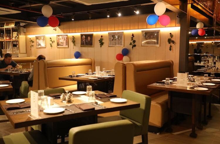 This restaurant design theme epitomises traditional look with a modernist setting of geometric hard floors and imposing impressionist murals. Natural materials and neutral colours comprise every fixture and every fitting, making an added aesthetic antidote to the exuberant restaurant setting.