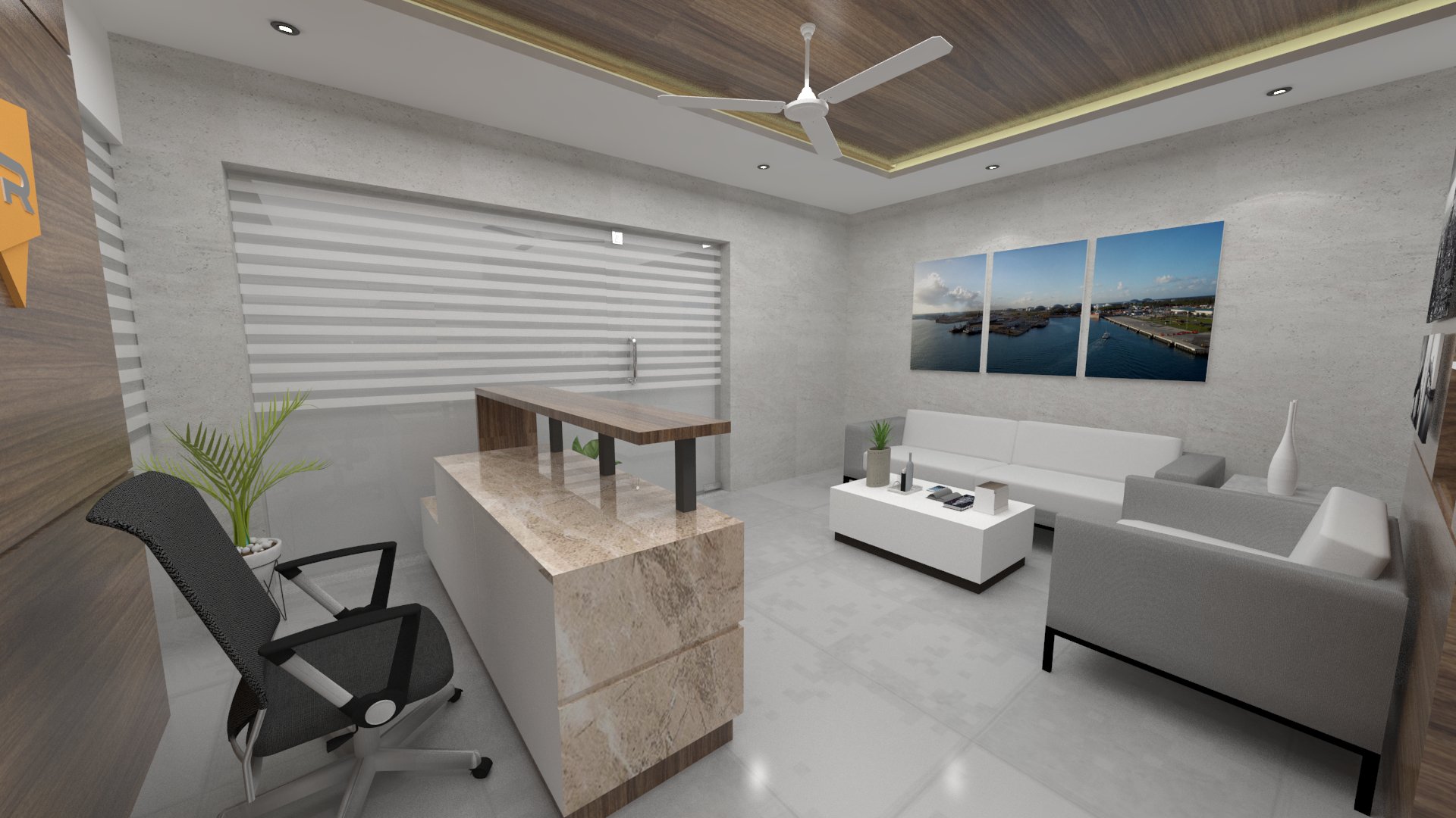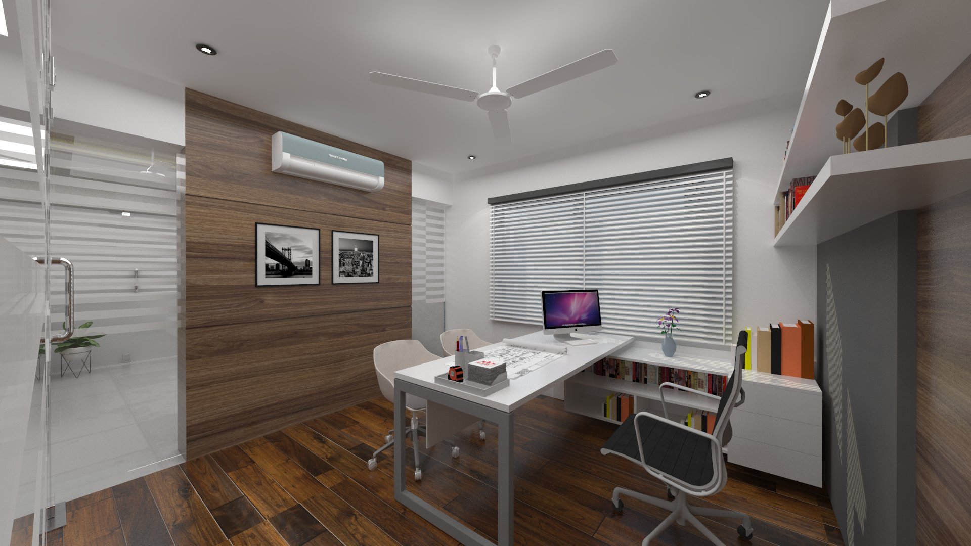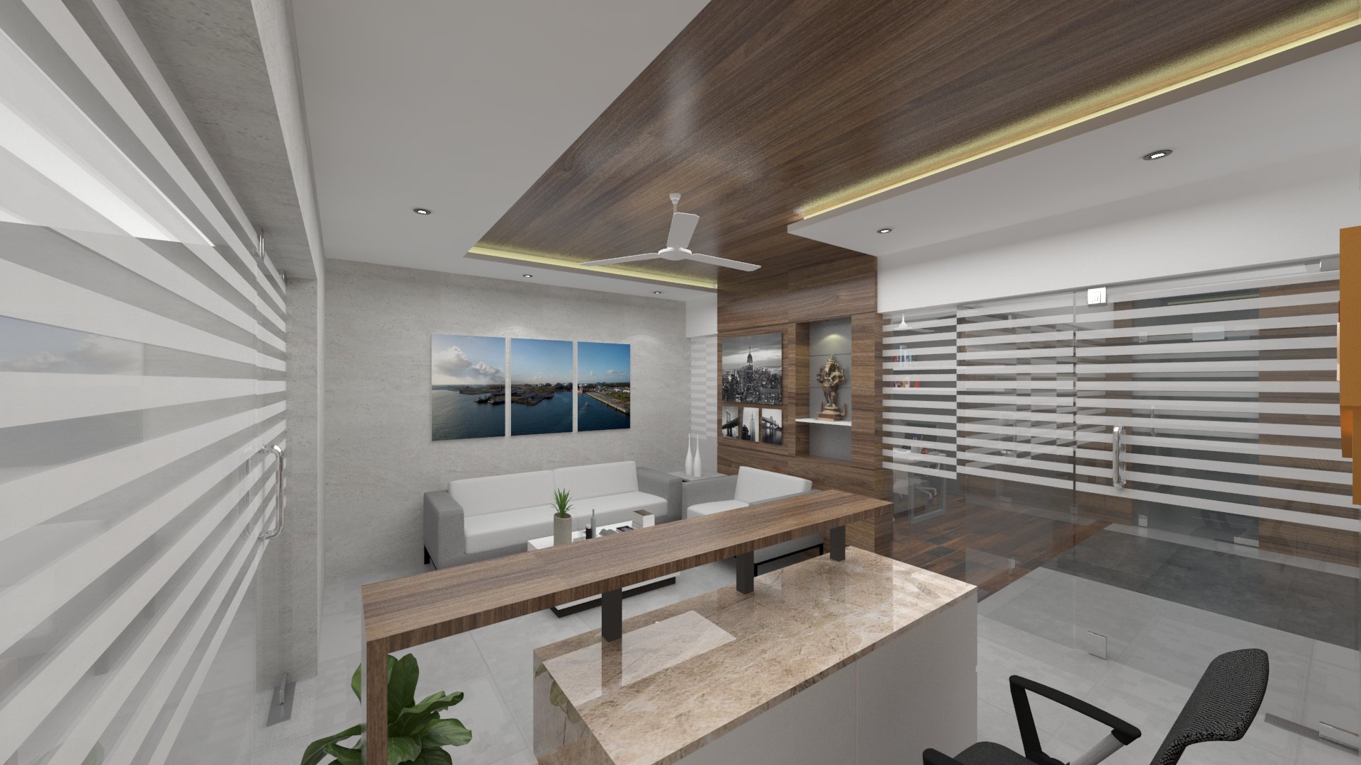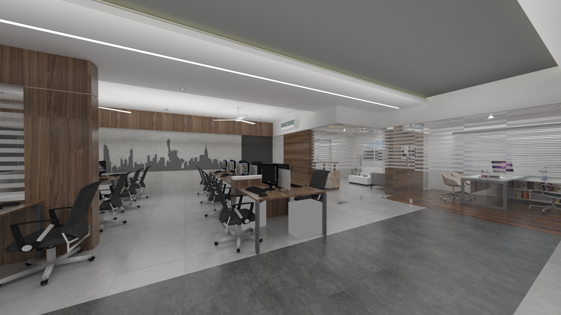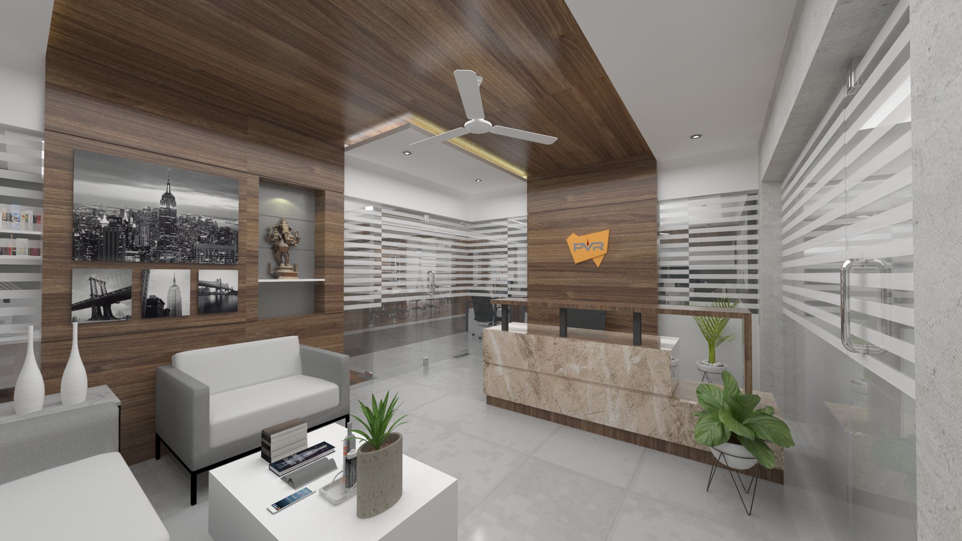 Design brief for this office interior was to create a bright and vibrant work space, with enough room between seating areas as well as cabins, and use of natural light to the maximum.