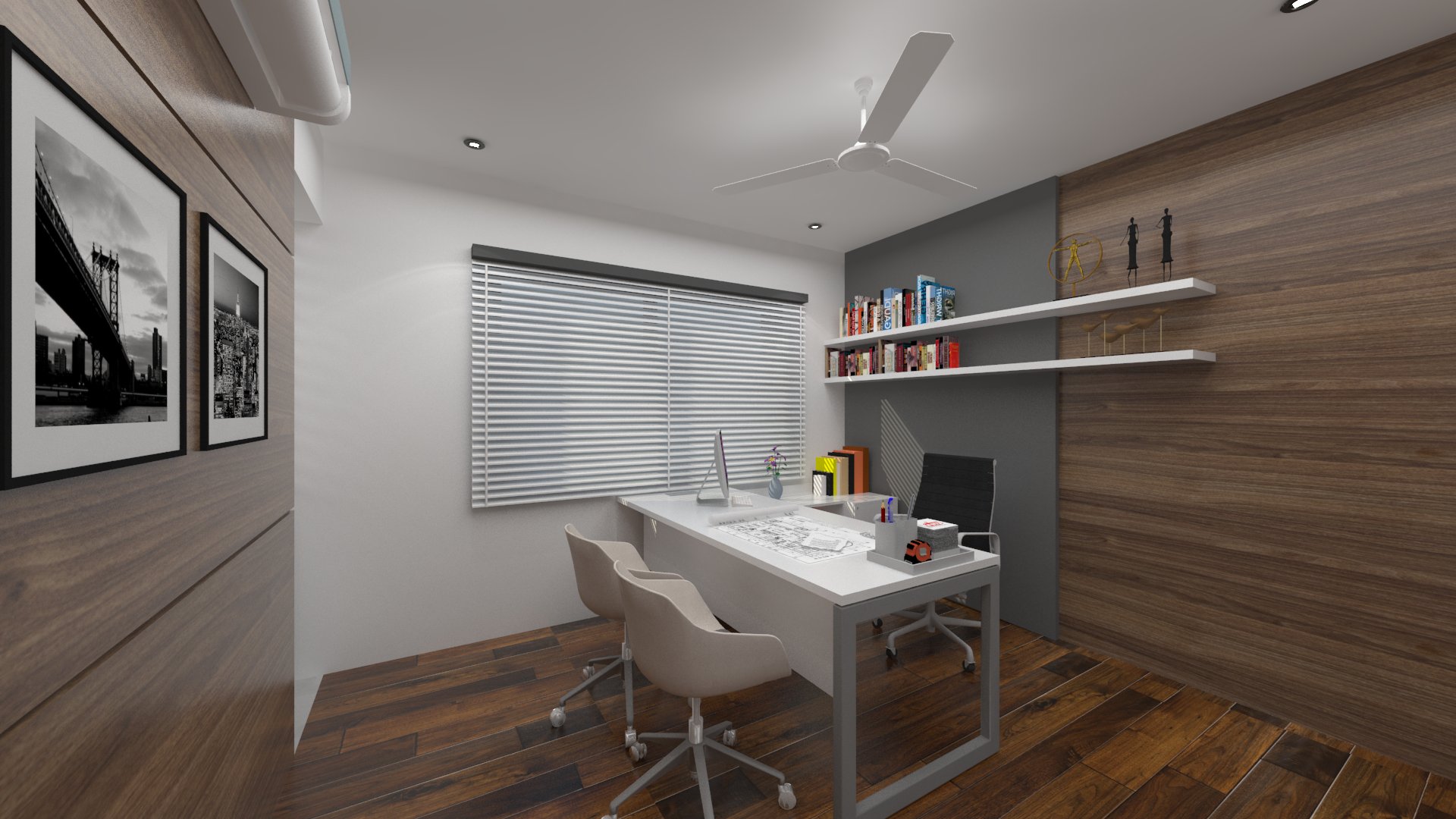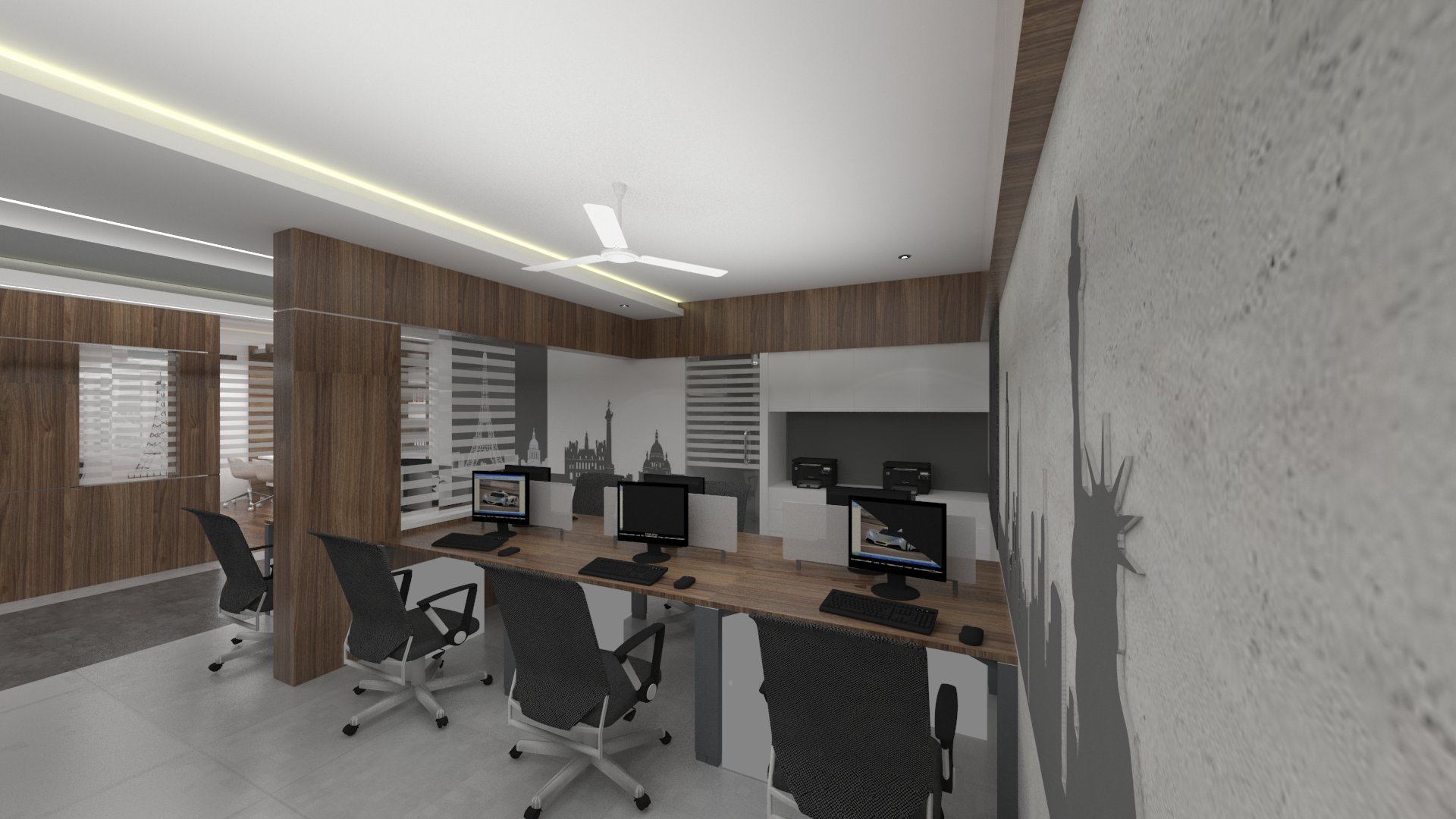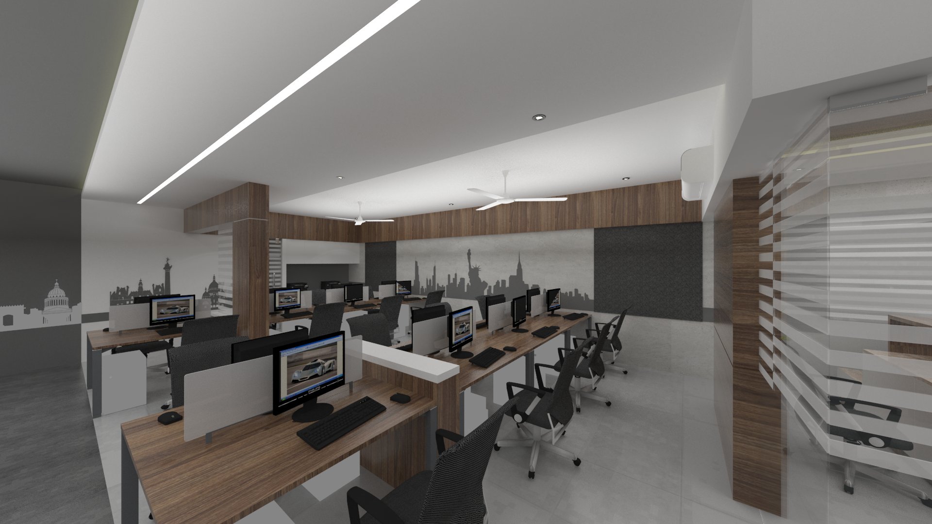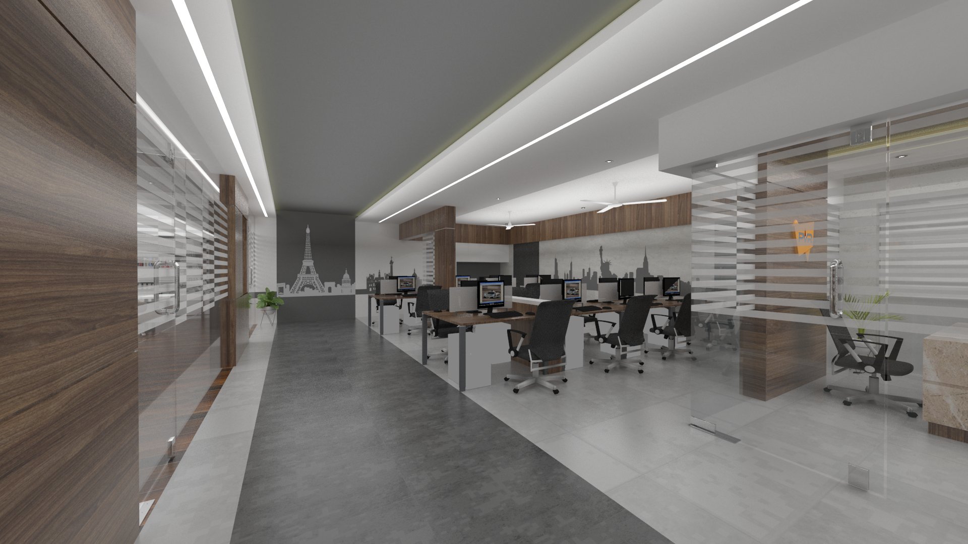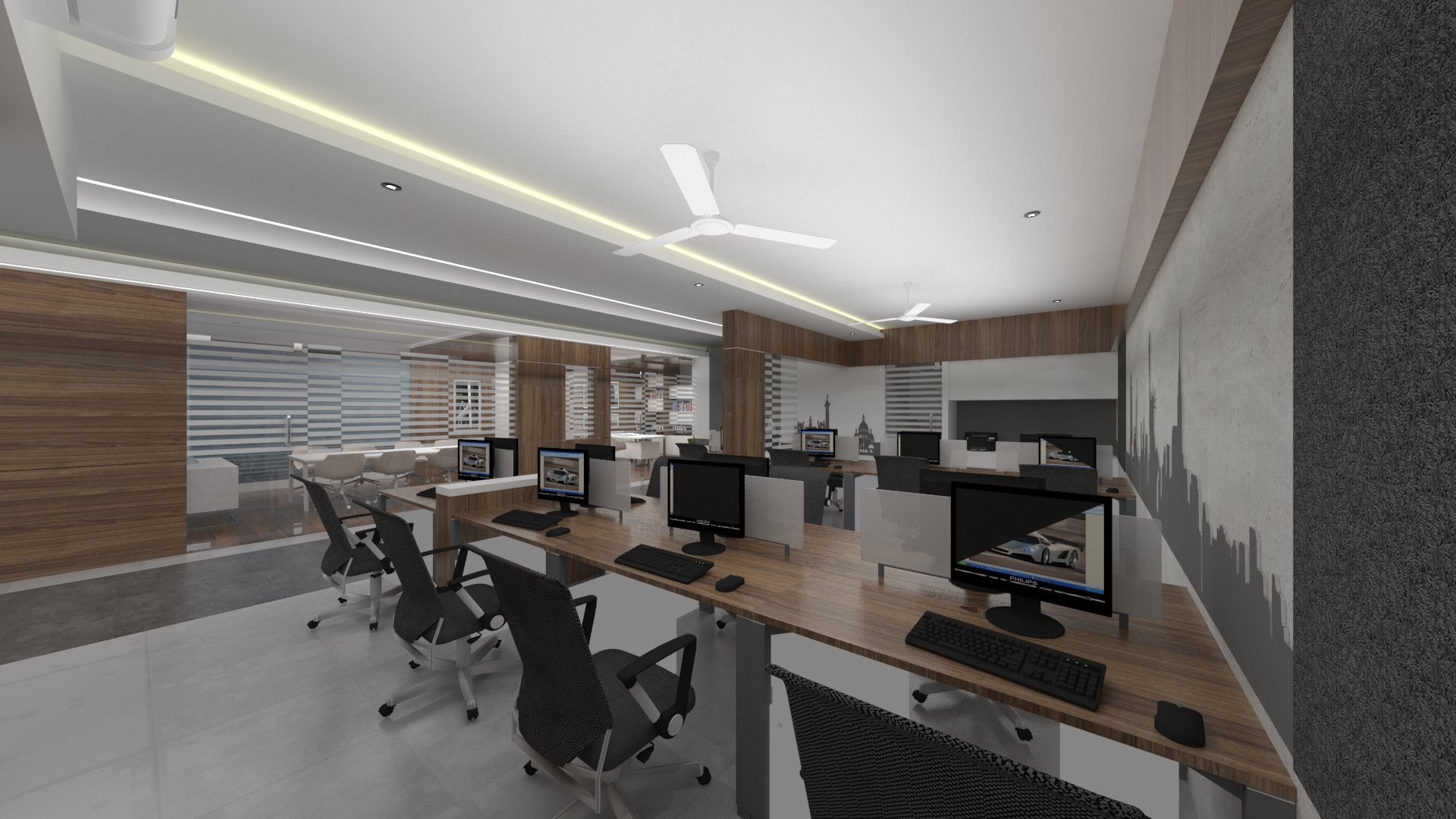 Design brief for this office interior was to create a bright and vibrant work space, with enough room between seating areas as well as cabins, and use of natural light to the maximum.