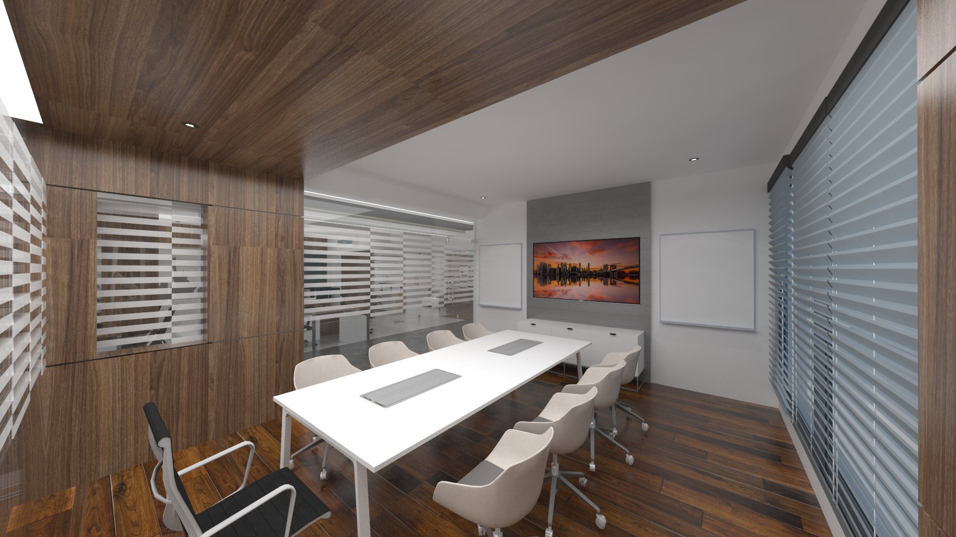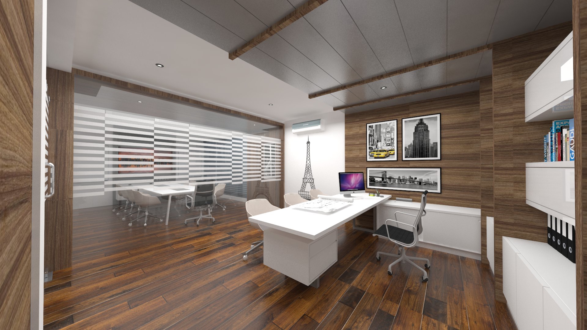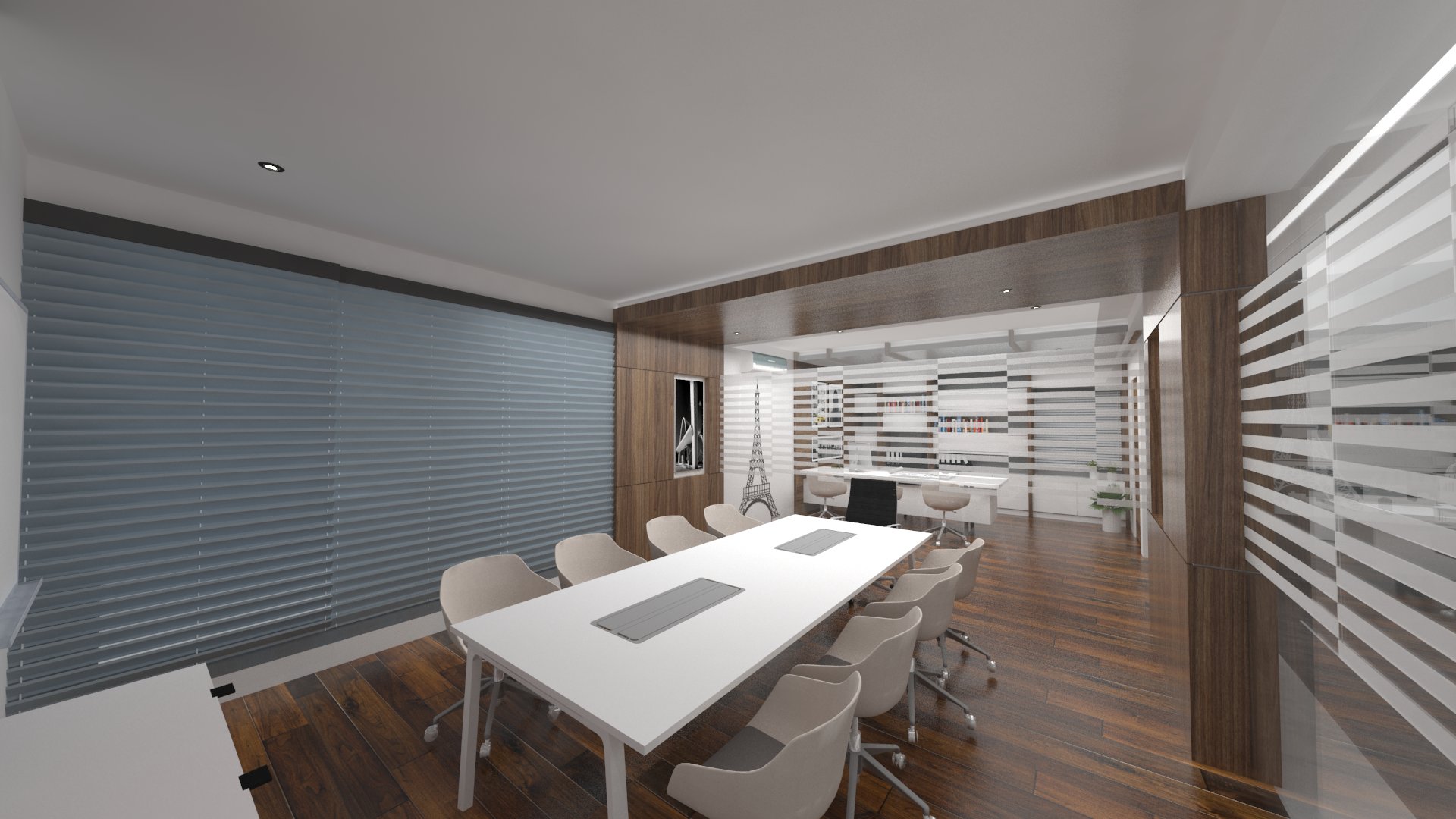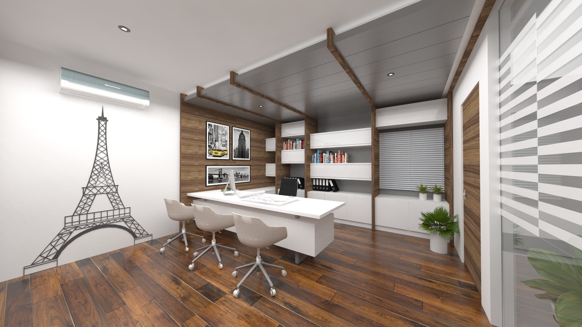 Add to it, a transparent ceiling fills the office interior with natural light, ensuring an airy feeling to the whole area.